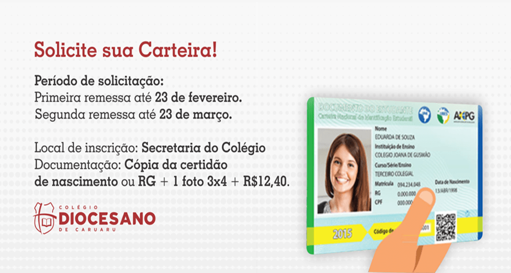 A Secretaria do Colégio Diocesano de Caruaru continua recebendo solicitação da carteira de estudante 2018. Passado o prazo da primeira remessa, que foi até o dia 23 de fevereiro, os interessados têm até o dia 23 de março para solicitar a sua.