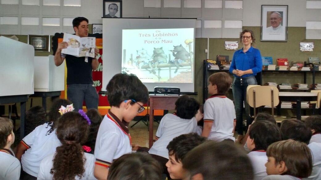 A biblioteca recebeu os alunos dos 3º anos para a contação e encenação da história ‘Os três lobinhos e o porco mau’, livro escrito por Eugene Trivizas e Helen Oxenbury.
